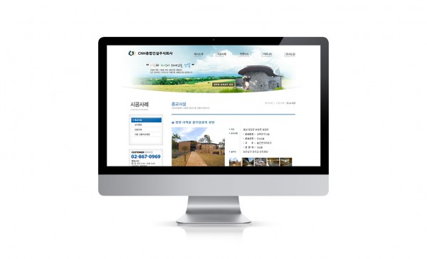 – 건설사가 시공한 건물에 대한 포트폴리오 노출에 촛점을 맞추었다. ‘사람과 자연이 하나되는 건설’이라는 기업모토를 반영한 green 및 brown칼라를 메인으로 사용하였고 메인 하단에 플래쉬기능을 사용하여 건설사 시공사례를 롤링배너 형식으로 제작하였다.